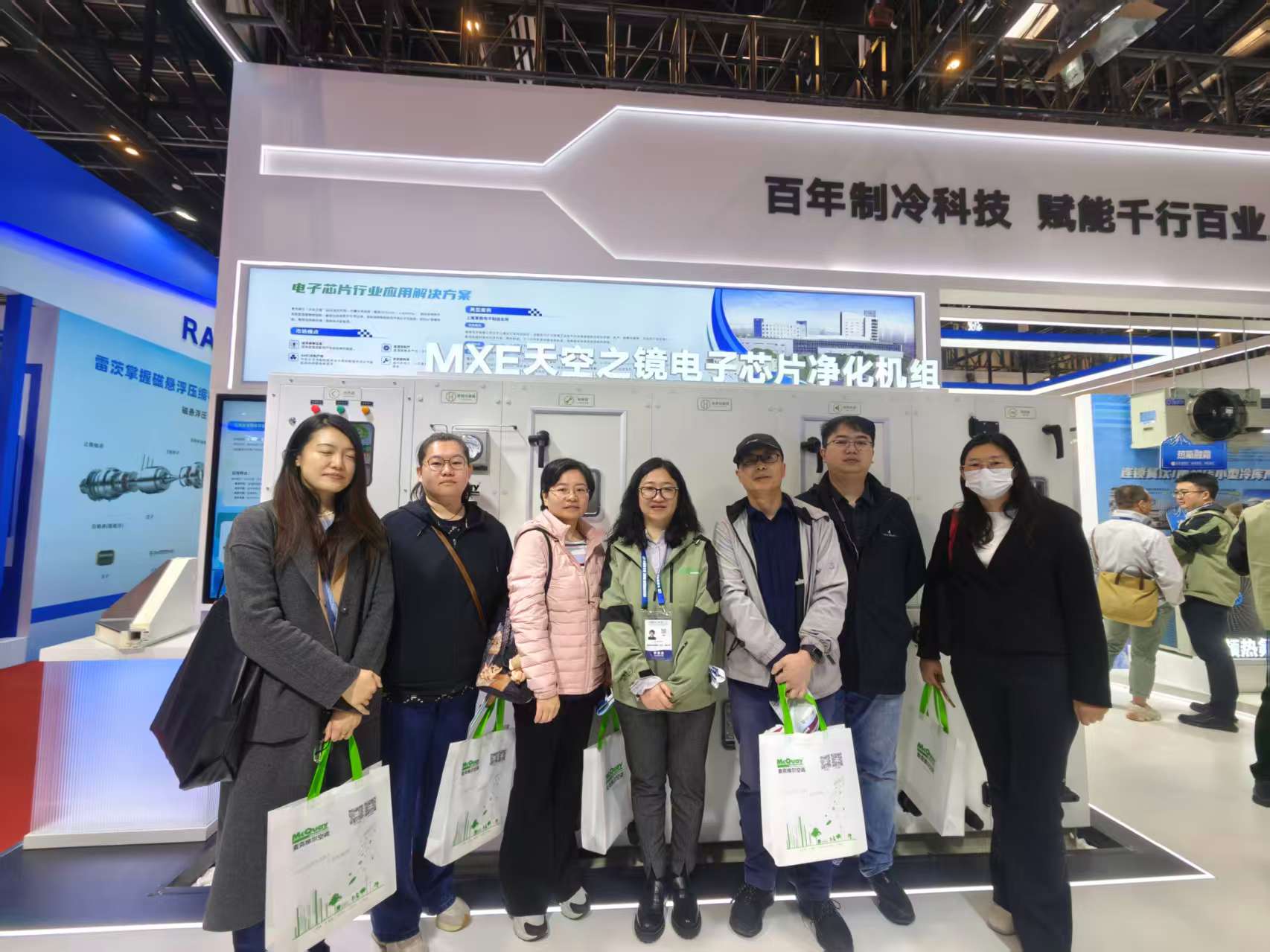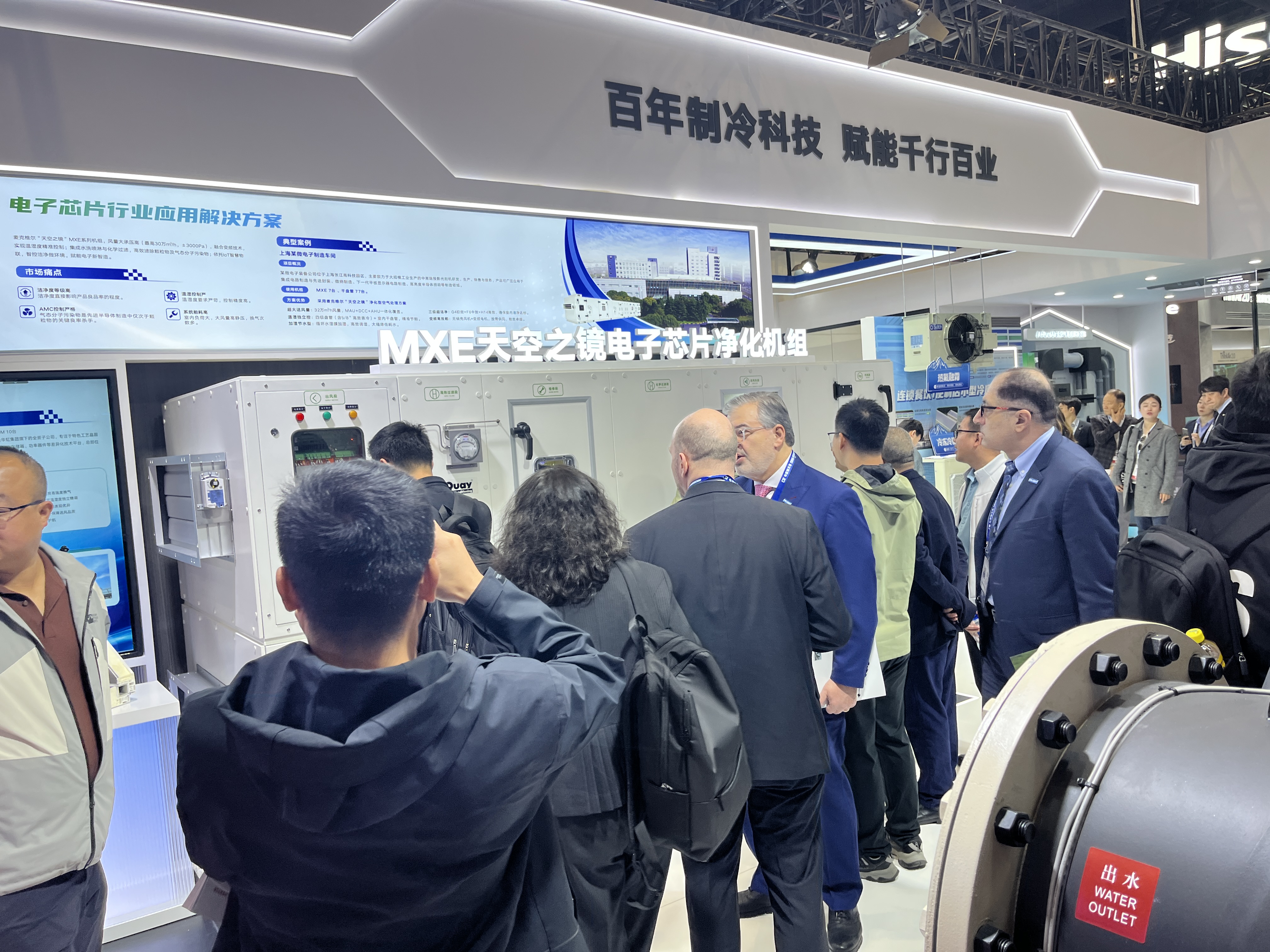 本次展会,麦克维尔聚焦高效节能与绿色低碳,展出 WTCV 超高效变频离心式冷水(热泵)机组、WLT HFO 制冷剂多级压缩离心式冷水机组,满足大型公共建筑与半导体行业节能降碳需求;MXE“天空之镜” 电子芯片净化机组、MAC 全变频四管制风冷热泵机组,精准适配工业精密净化场景;MGC 低温储粮专用机组、变频热氟融霜冷冻冷藏机组,深耕新农业与冷链物流民生领域。